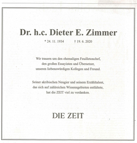 “Publizist und Literaturübersetzer Dieter E. Zimmer ist tot,” Die Zeit, 29 June 2020 (unsigned)