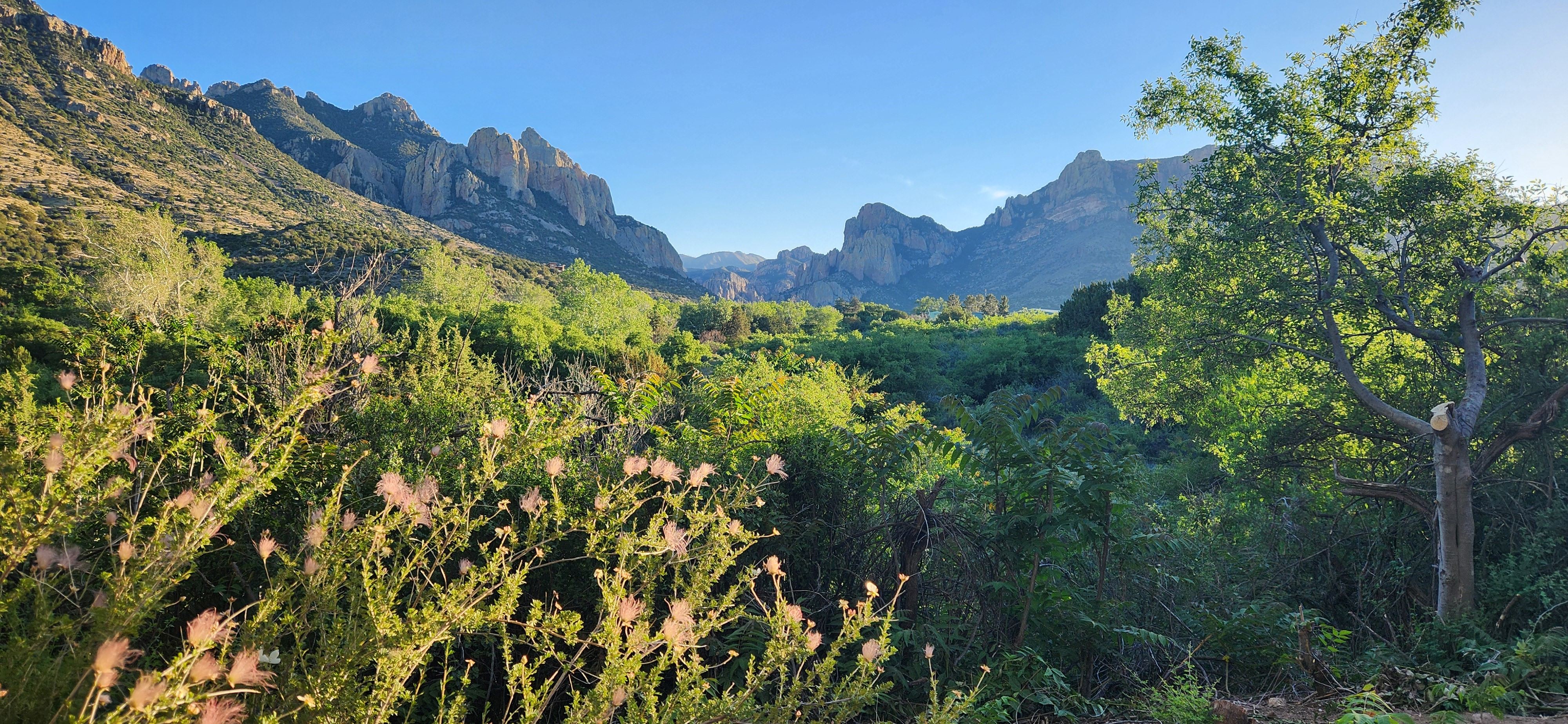 View from rear of the Nabokovs' cottage in Portal, Arizona, April-May 1953, showing mouth of Cave Creek Canyon and Chiricahua Mountains. © John Grahame