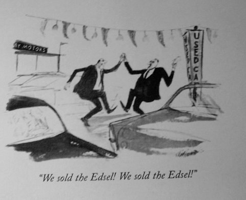 Nabokov's Chapter Fifteen ("Gardens and Parks", SM) was published in the New Yorker in 1950, beginning with an "Horatian inflection." Among Steinberg's cartoons from 1963 there is one, related to the same lines, themselves forming an entire TV-set., down to the plug. Another cartoon, from 1964, by Joseph Mirachi, commemorates what seems to be a fortunate sale:a used Edsel.