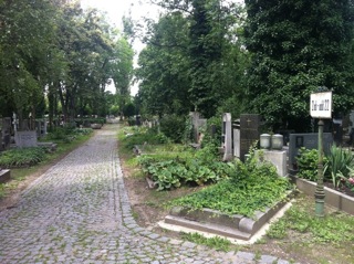 This is in the "Russian section"; a straight shot from the entrance to the part of Olsansky cemetery that physically touches the New Jewish Cemetery where Kafka is buried. If you are standing at the gate looking down the lane, you will see a Russian-esque church adorned with icon-like paintings. Just past it you will see the sign in the photo. Look down the lane as in the photo, Elena Nabokov's grave is the first full gravestone you see in the picture from the left.