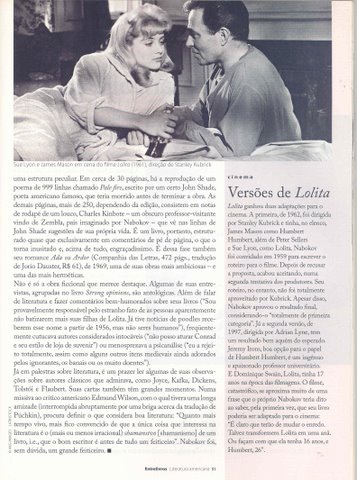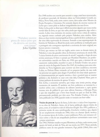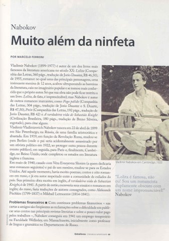 The information about Nabokov, "Beyond the Nymphet," signed by Marcelo Ferroni (editor of Alfaguara/Objetiva), presents a biographical sketch, with descriptions of VN's principal novels, memoirs, interviews and lectures. From Nabokov's correspondence with Wilson were extracted the closing lines of the article about "the writer as an enchanter(shamanstvo)."