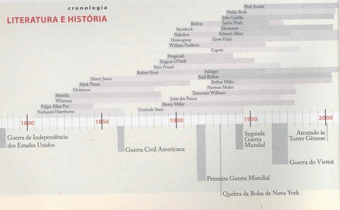 A popular magazine collection, with at least eight different volumes, "Cadernos Entre Livros" (Duetto/Ediouro, at www.lojaduetto.com.br) offers, in volume 3, a panoramic view of American literature to the general reader. The opening article, written by Marcos Soares, brings a chronological chart in which Nabokov's name appears close to the period when Steinbeck, Hemmingway and Faulkner published their works. His name is graphically extended into Edward Albee's, but I found no explanation for it in the pages I examined. Nabokov is also placed together with Bellow, Singer, Updike and Salinger as a representative of "American existencialism."