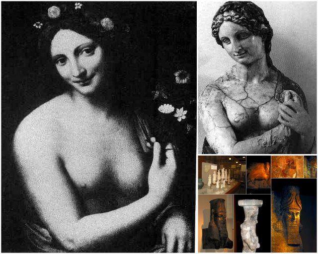 Indeed, those ancient sculptures of mesopotamiam warriors, kouroi, and bearded gods often bore a loopsided smile which - while perusing a book about "Fake? The art of deceit" (edited by Mark Jones,University of California Press,1990) led me to Leonardo da Vinci's Mona Lisa smile, actually, in the present case, to a "fake" bust of da Vinci's "original Flora".