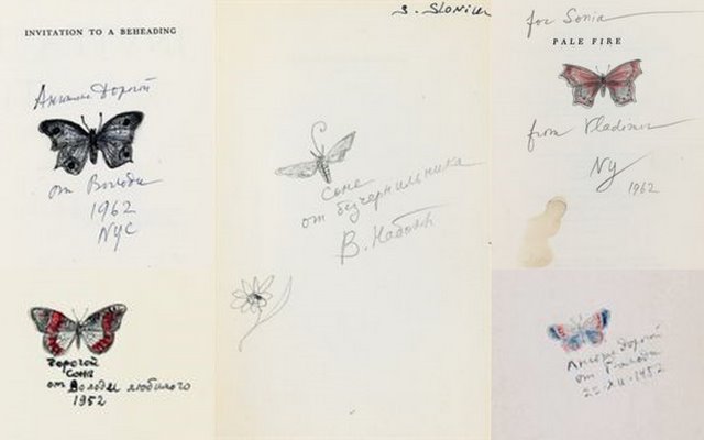 The two "untitled" items are, at left, inscription and butterfly inside "Bend Sinister" and, at right, from his collected poems.