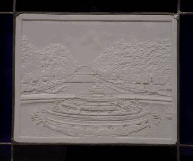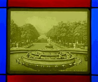 German lithophane of the Fountain in the Park of Versailles mounted in a blue and red glass frame. When the ambient light is extinguished and the lithophane is back-lit, a beautiful, three-dimensional picture appears in incredible depth and detail. When you see the actual lithophane at the Blair Museum, you will see some additional lithophane magic which cannot be seen in a two dimensional photograph. Due to the three dimensionality of lithophanes, the perspective will change as you walk past the lithophane. The avenue behind the fountain actually appears to move.