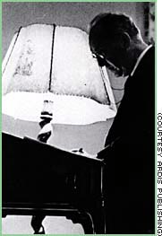 his lectern. He appears to be holding the pen in his left hand, which may