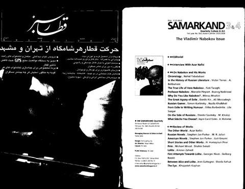 EDNOTE. Some time ago I ran across a reference to a special issue of the Iranian journal _Samarkand: Quarterly Journal Culture and Art_. The editor,Tooba Satei, kindly sent me two ssues: one devoted to Nabokov; the other to Beckett. The contents, apart from a supplementary table of contents, is in Iranian. The handsome, well-illustrated journal appears to be largely translations of excerpts from VN's work plus articles by Iranian and foreign authors. Iner alia. there is an interview with Azar Nafisi.