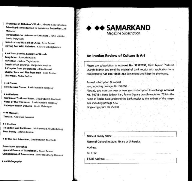 Subject Nabokov issue of Iranian journal Samarkand From D. Barton Johnson Date Tue, 09/13/2005 - 14:21 Body Part 2 Attachment NABOKV-L-0011856___body.html (349 bytes) NABOKV-L-0011856___Samarkand 001.jpg (70.41 KB)