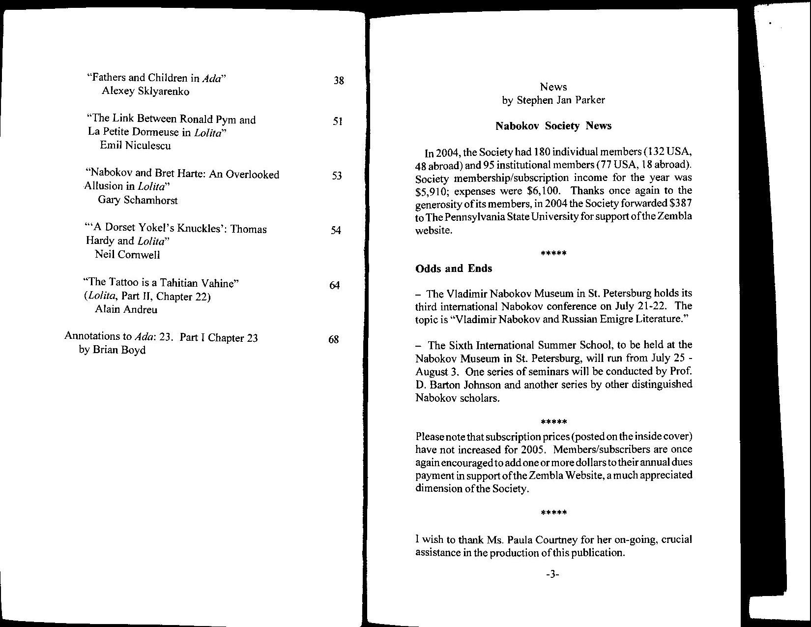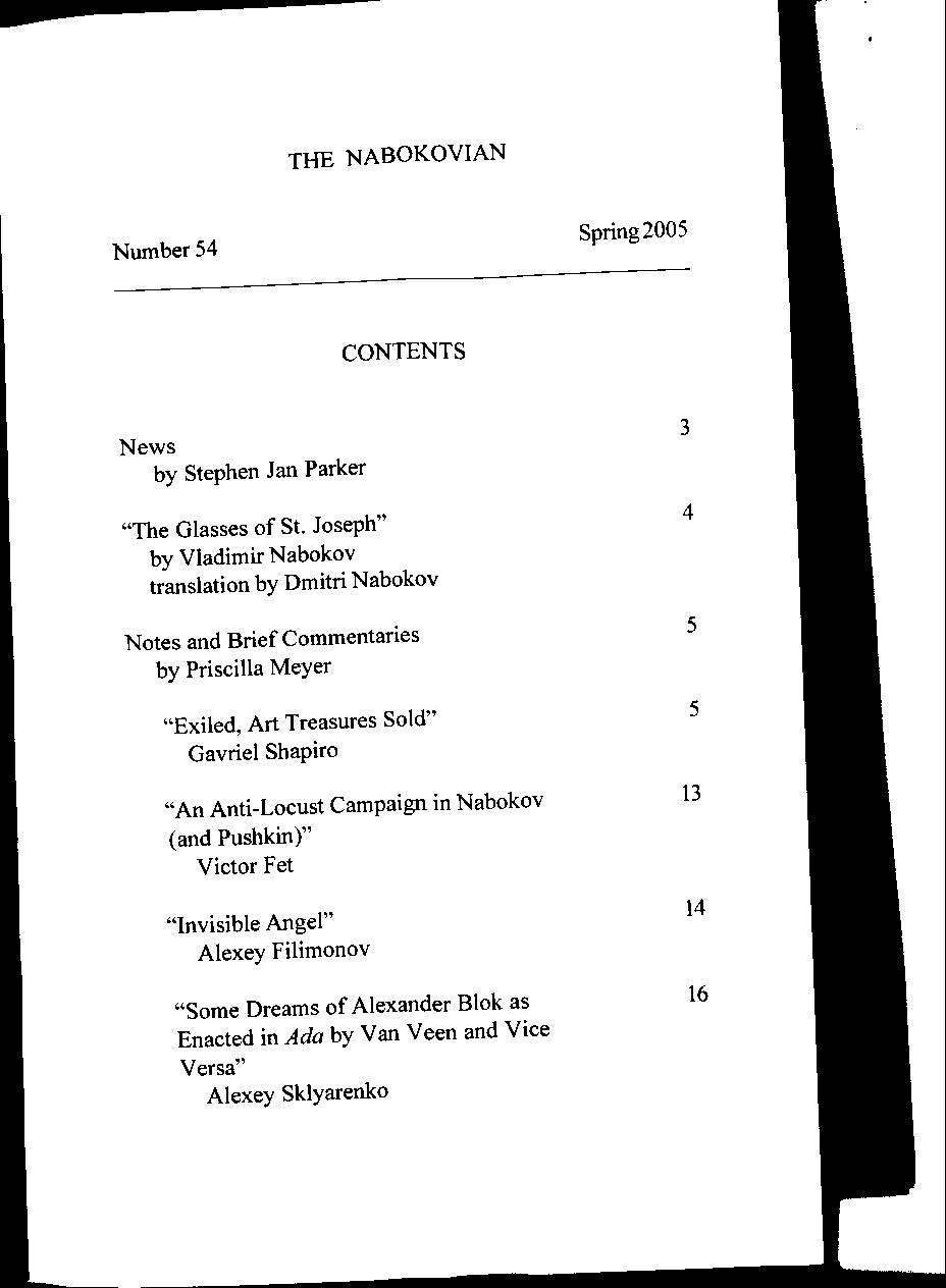 Subject Table of Contents: THE NABOKOVIAN #54 From D. Barton Johnson Date Sun, 10/09/2005 - 00:14 Body For subscription information, please contact the editor Steve Parker <sjparker@ukans.edu> Attachment NABOKV-L-0011977___body.html (528 bytes) NABOKV-L-0011977___TN54 001.jpg (232.45 KB) NABOKV-L-0011977___TN54 (3).jpg (88.83 KB)