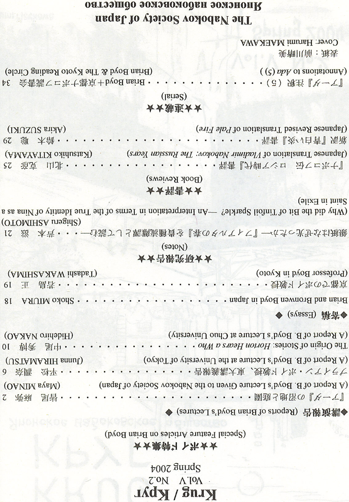 the new issue of the very Japanese VN Society (Vol. V, #2: Spring 2004). The issue, mostly in Japanese, is chiefly devoted to Brian Boyd's lecture trip to Japan in conjunction with the publication there of his VN biography.