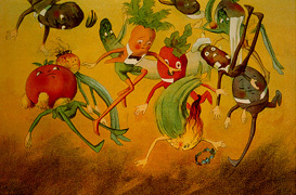 This image appears to be drawn from yet another of Upton’s books—The Vegeman’s Revenge (1897), one of the few that did not feature the Golliwogg and his penny-woodens. Its plot obviously arises from the similarity of “Vege-Men” and “revenge.” Its heroine, young Miss Poppy Cornflower, is sent to the kitchen garden to pick some vegetables. There, Harry Carrot and Don Tomato offer to escort her down to the vegetable kingdom so that she may learn how they grow. In a pumpkin coach drawn by an onion, they drive through a hole in the ground to arrive at King Murphy’s court.19 The King, a potato, of course, addresses Poppy: