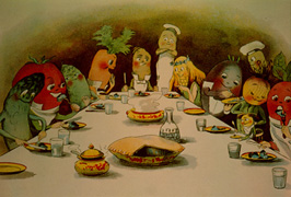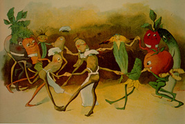 King Murphy orders Poppy be planted and grown as food for a royal banquet. The ripened melons bearing Poppy’s features are duly picked, cooked, and set out for the banquet which is accompanied by a minstrel band. The animated vegetables feasting on Poppy include a tomato, a carrot, Miss Corn (with yellow silk tassel and a green sheath dress), King Murphy, an asparagus stalk, an egg plant, a Bermuda onion, a beet, cucumber, and turnip.