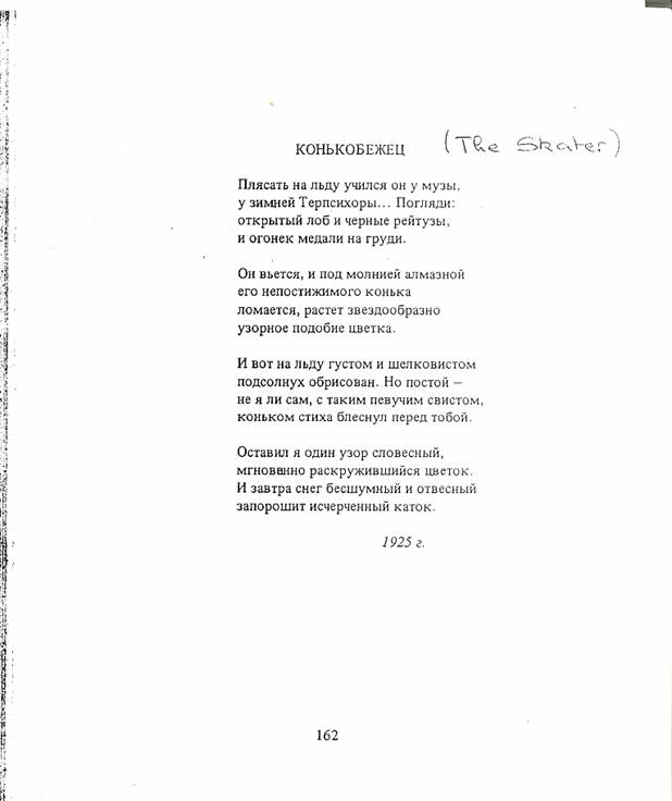 MessageEDNOTE. Dmitri Nabokov has very kindly sent us the Russian original and his English translation of the 1925 poem "The Skater." It appears with five others in the Cambridge-based journal Areté.