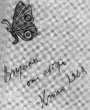 Прежде всего он необычно иллюстрирован, и не постоянным художником "Вышгорода" В.Станишевским, а... работами самого Набокова. Бабочка, нарисованная великим писателем в 1968 году, замечательно вписалась в обложку журнала (который в последнее время был белым) и, похоже, соответствует его эстетике. Об этой и других бабочках - рассказ Вадима Старка, научного сотрудника Музея В.В.Набокова. И не только о них: Набоков рисовал и портреты литературных героев, например, Анну и Китти из "Анны Карениной" Л.Толстого, и пейзажи, и топографические планы. Писатель был хорошим рисовальщиком, учился живописи у своей матери, а рисунку - у знаменитого Добужинского, который находил в нем талант художника. Его чувство цвета, "азбучная радуга", в которой каждая буква имела свою окраску, несомненно, нашло отражение в поэтике его прозы. А бабочка - своего рода печать, сопровождавшая большинство писем к близким, многие рукописи, собственную фотографию, где писатель запечатлен совсем молодым, трогательные послания жене. Она порхает и по всему журналу, появляясь в иллюстрациях и на вклейках - то цветная, то черно-белая. Бабочки были и реальные, изображенные со скрупулезностью энтомолога, и фантастические, с придуманными "латинскими" названиями.