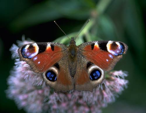 Nabokov often used butterflies in his work as parts of meaningful patterns and such is the case for the Vanessa io or Peacock butterfly in Speak, Memory. It first occurs in the Foreword where Nabokov writes of his enormous effort to recall missing details from his past. A cigarette case is mentally retrieved thanks to its conjuncture with the location where the young Nabokov had caught a rare hawkmoth in June 1907 and where his father had, many years earlier, first encountered "a Peacock butterfly very scarce in our northern woodlands." The scene triggering the recollection is played out in full in chapter three, scene seven where Nabokov writes of "the almost pathological keenness of the retrospective faculty" he believes he inherited from his father. As an example of his father's powers of memory he writes "There was a certain spot in the forest, a footbridge across a brown brook, where my father would piously pause to recall the rare butterfly that, on the seventeenth of August, 1883, his German tutor had netted for him. The thirty-year-old scene would be gone through again. He and his brothers had stopped short in helpless amazement at the sight of the coveted insect poised on a log and moving up and down, as though in alert respiration, its four cherry-red wings with a pavonian eyespot on each. In tense silence, not daring to strike himself, he had handed his net to [his tutor] Herr Rogge, who was groping for it, his eyes fixed on the splendid fly. My cabinet inherited that specimen a quarter of a century later." Nabokov does not name the butterfly in the scene. It is that "pavonian eyespot" that confirms the identification: "Pavonian" referring to the circles on the insect's wings resembling those on the tail of the peacock. Dieter Zimmer's magnificent A Guide to Nabokov's Butterflies and Moths 2001 pictures the butterfly and provides an excellent description. The very handsome creature is bit over two inches (50-60mm) in wingspread: "In the corners of each of its dark reddish brown and quiet ragged wings there is a large eyespot, a red one on the primaries and a blue one on the secondaries (p. 176). Zimmer also notes that in the spring of 1972, Nabokov netted a Peacock in the gardens of the Montreaux Palace Hotel while being filmed for a German TV documentary.