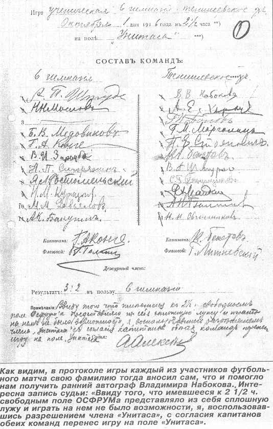 EDNOTE. NABOKV-L thanks Aleksandr Svirilin for this fascinating item. Translation and contents at bottom. I might add that a recent study of GLORY focuses on VN and sports. See David Larmour's "Getting one past the goalkeeper: sports and games in GLORY," pp. -59-73 in _Discourse and Ideology in Naokov's Prose_ . Ed. David H. J. Larmour. Routledege Harwood Academic Publishers, London.
