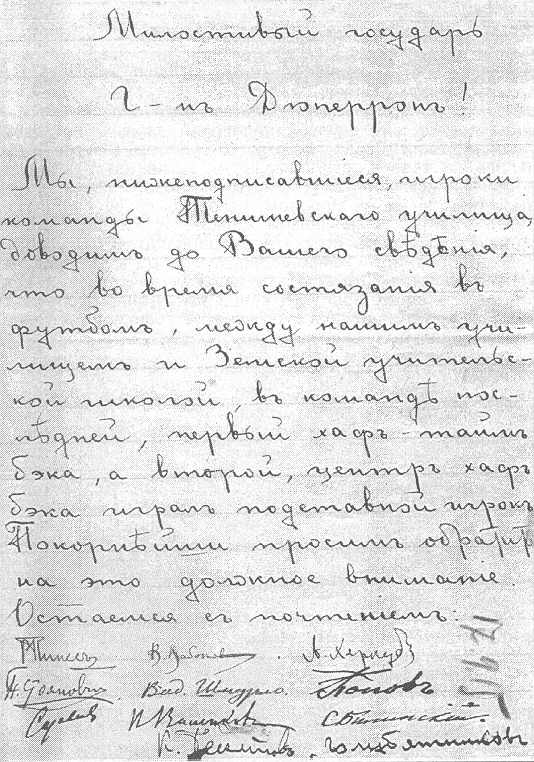 The attached files include the copies of related documents:1) the magazine article text 2) a document with the signed names of the Tenishchev School team 3) a letter signed by team members protesting the use of a "ringer" by an opposing team.