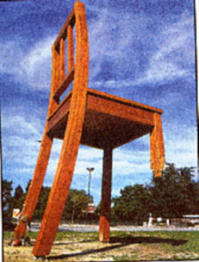 To bring a smile to those who recall the Famous Controversy About the Three-Legged Chair (a photographic illusion obscured the fourth in an image of the VN statue that Moscow presented to Montreux for the Centennial), I attach a chair on which my father was not sculpted. It is an oversize piece of "statuary" at the United Nations complex in Geneva.