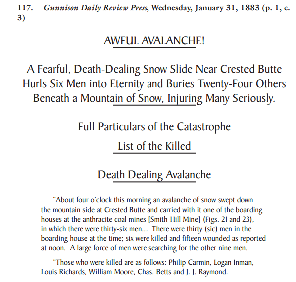 While truffling for trifles in “The Vane Sisters” (which I am teaching later today) I set off on a quest to locate “John Moore, and his brother Bill [who] had been coal miners in Colorado and had perished in an avalanche at ‘Crested Beauty’ in January 1883.” I didn’t find much to go on, but eventually happened upon a copy of The Annual Statistician and Economist, which contained a wonderful list of 1880s calamities (“Giant powder works destroyed by explosion, 10 chinamen killed,” “Panic on Brooklyn Bridge, 12 killed,” “Steamboat Riverdale bursts her boiler, 3 killed,” etc.) including, on Jan 30, 1883 the following: “Snow slide 3 miles from Crested Butte, Col., 5 killed, 25 injured.” With that info, I did some more checking and found a newspaper account from a week later (but no names). That in turn led to a Dept of Agriculture document called “Historic Avalanches in the Northern Front Range and Central and Northern Mountains of Colorado,” which contains the attached account from the Gunnison Daily Review Press, Wed., January 31, 1883. In case you can’t access the screen shot, it gives a brief account of the avalanche striking a coal camp and lists, among the dead, a William Moore. I presume this is the Bill Moore VN placed in “The Vane Sisters.” No word of his brother John, I’m afraid!