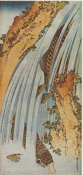 Here's the better known of his carp in waterfall (two fish--one could imagine that the lower one is not going to make it; but we can suspect that Nabokov knew only the image, not the legend) and a Hokusai carp image I like even more, almost monochrome, with two turtles also enjoying the water and its ripples.