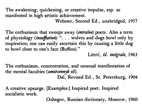 He goes on to delineate a few types of inspiration, akin to Malcolm Cowley's four stages of the creative process, and writes: