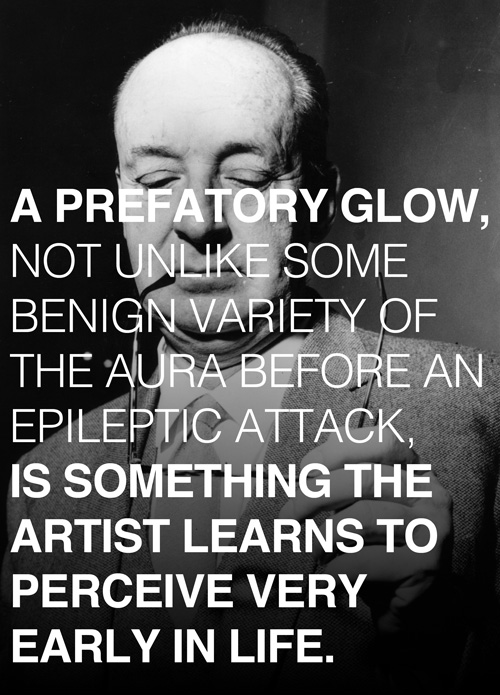 "A prefatory glow, not unlike some benign variety of the aura before an epileptic attack, is something the artist learns to perceive very early in life."
