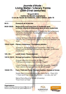 I'll be giving the plenary lecture on "Dead-Leaf Butterflies: A Biosemiotic Approach to Mimesis in Nabokov" at the Sorbonne Nouvelle in Paris April 19th. All are welcome to attend the bilingual one-day conference : "Living Matter / Literary Forms." See attached flyer.