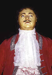 Note the mention of vino (ethyl alcohol used for conservation of monsters in the Kunstkammer). Voskovaya persona (wax person) is the famous post-mortem model of Peter I by Carlo Rastrelli (see blow). St. Petersburg was founded by Peter I in 1703 and renamed Leningrad in 1924, after Lenin's death. Kinbote mockingly calls Gradus Vinogradus and Leningradus.